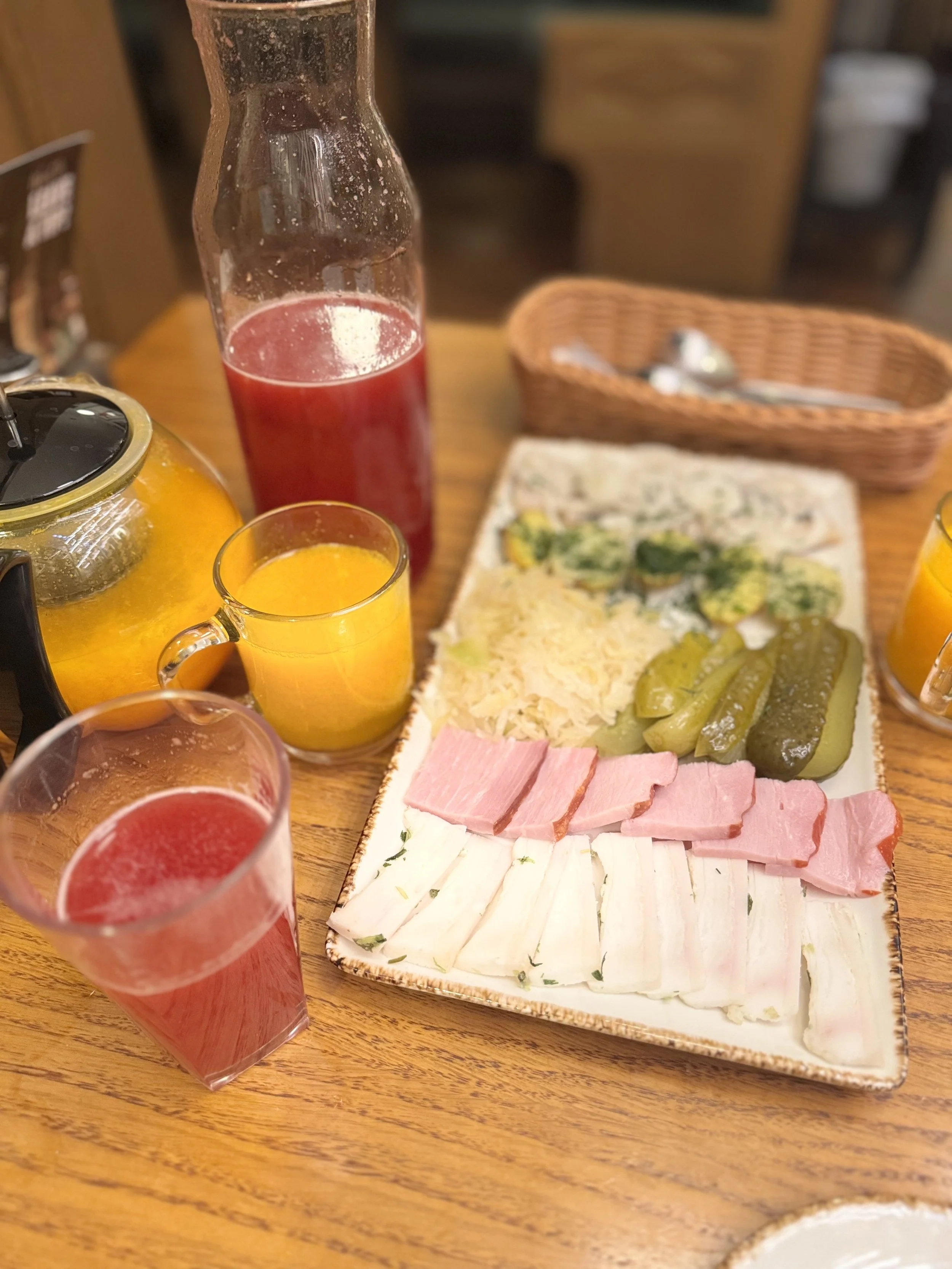 Cleansed, relaxed and with skin as smooth as butter, we went to our relaxation booth where we were served cucumber water, sea buckthorn tea, fresh cranberry juice, borscht soup, smoked ham, pork lard (my favourite) and cottage cheese pancakes with blueberries.