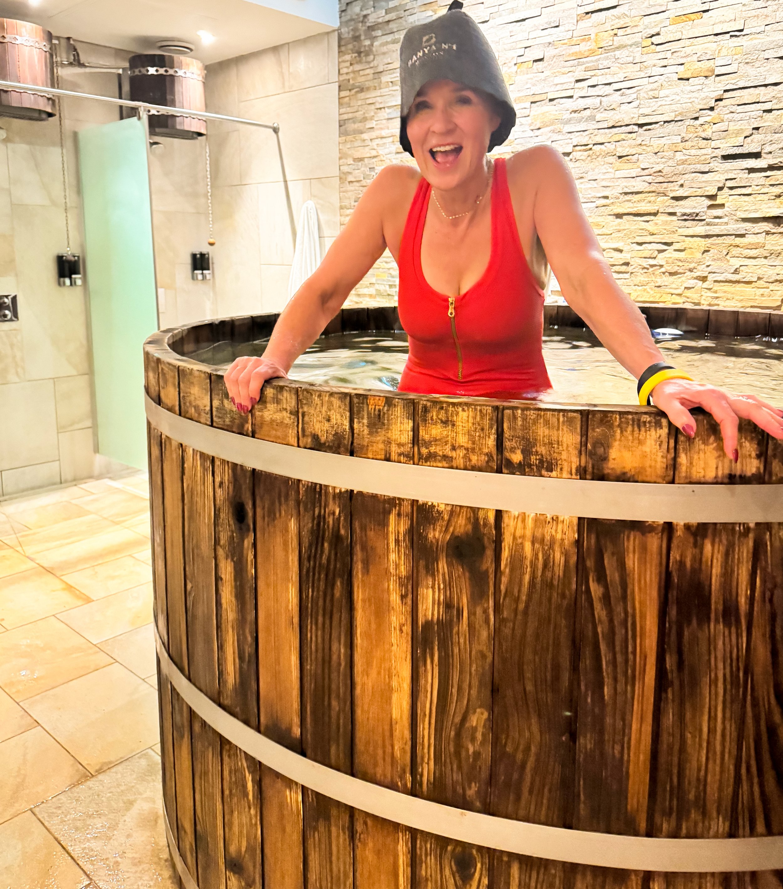 First off we changed into our swimmers, sat in a hot sauna for a few minutes to work up a sweat, then took a cold shower and an even colder dip into a giant barrel of freezing water.